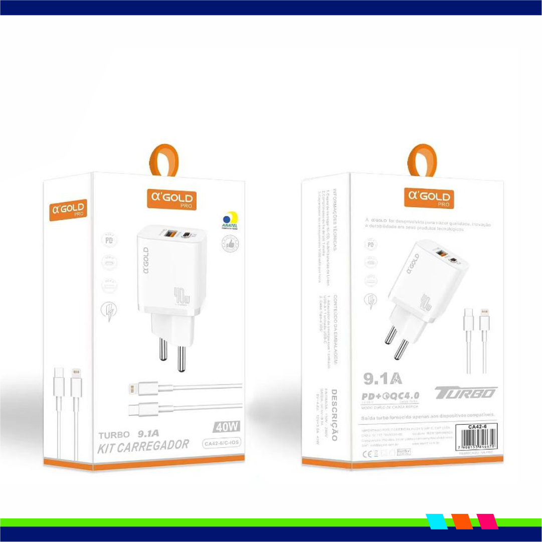 Carregador A’GOLD Turbo 9.1A 40W com Entradas USB-C e USB-A para iPhone